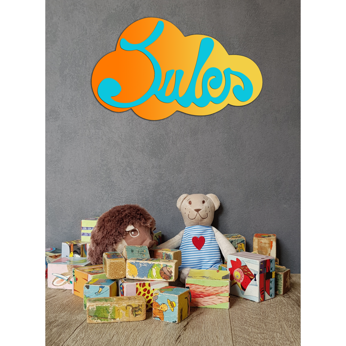 -Le Prénom est réalisé à la main, à la scie à chantourner, puis protégé par un vernis acrylique satin.