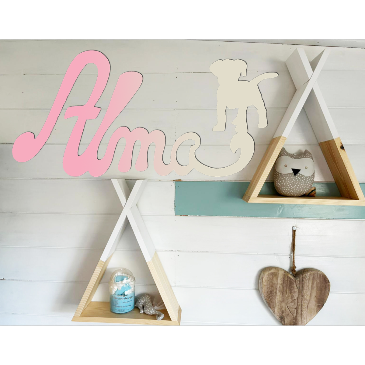 Découvrez cette jolie plaque de porte personnalisée en bois, avec motif Chien en bout de prénom de couleur dégradé Lilas/Ecru.