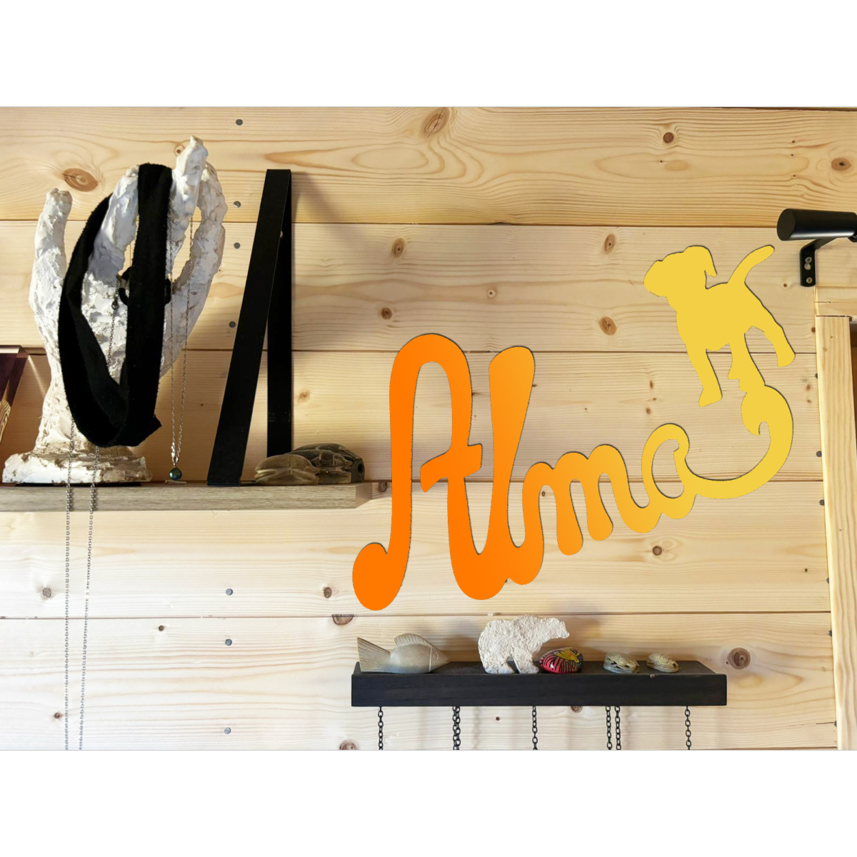 Découvrez cette jolie plaque de porte personnalisée en bois, avec motif Chien en bout de prénom de couleur dégradé Orange/Jaune.