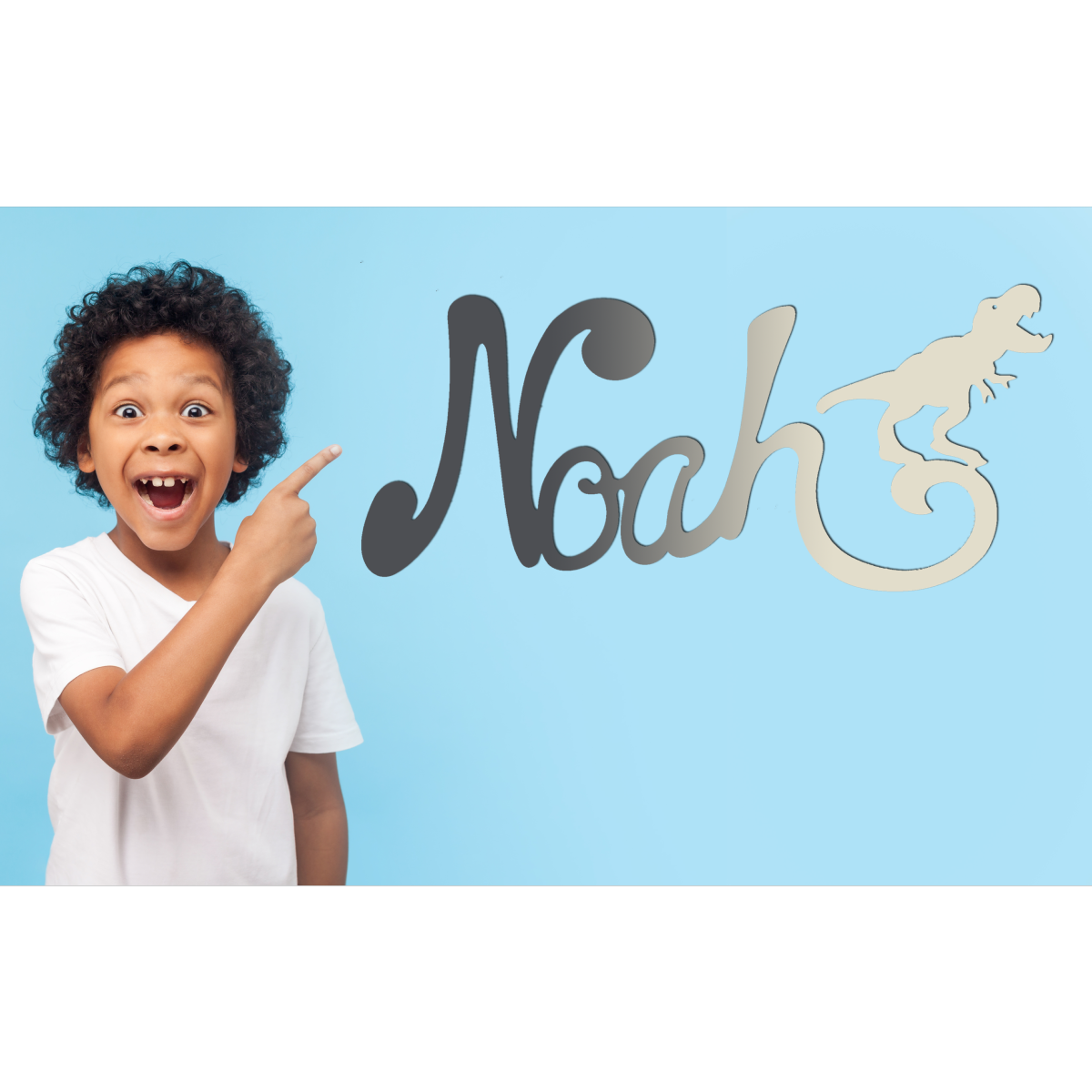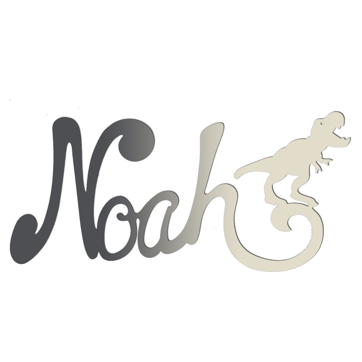 Découvrez cette jolie plaque de porte personnalisée en bois, avec motif Dinosaure en bout de prénom de couleur dégradé Anthracite/Ecru.