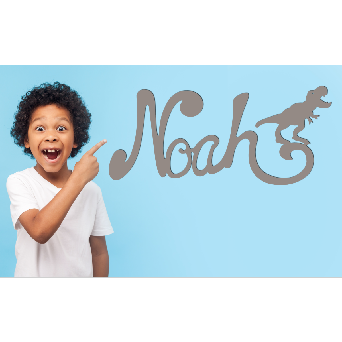 Découvrez cette jolie plaque de porte personnalisée en bois, avec motif Dinosaure en bout de prénom de couleur mastic.