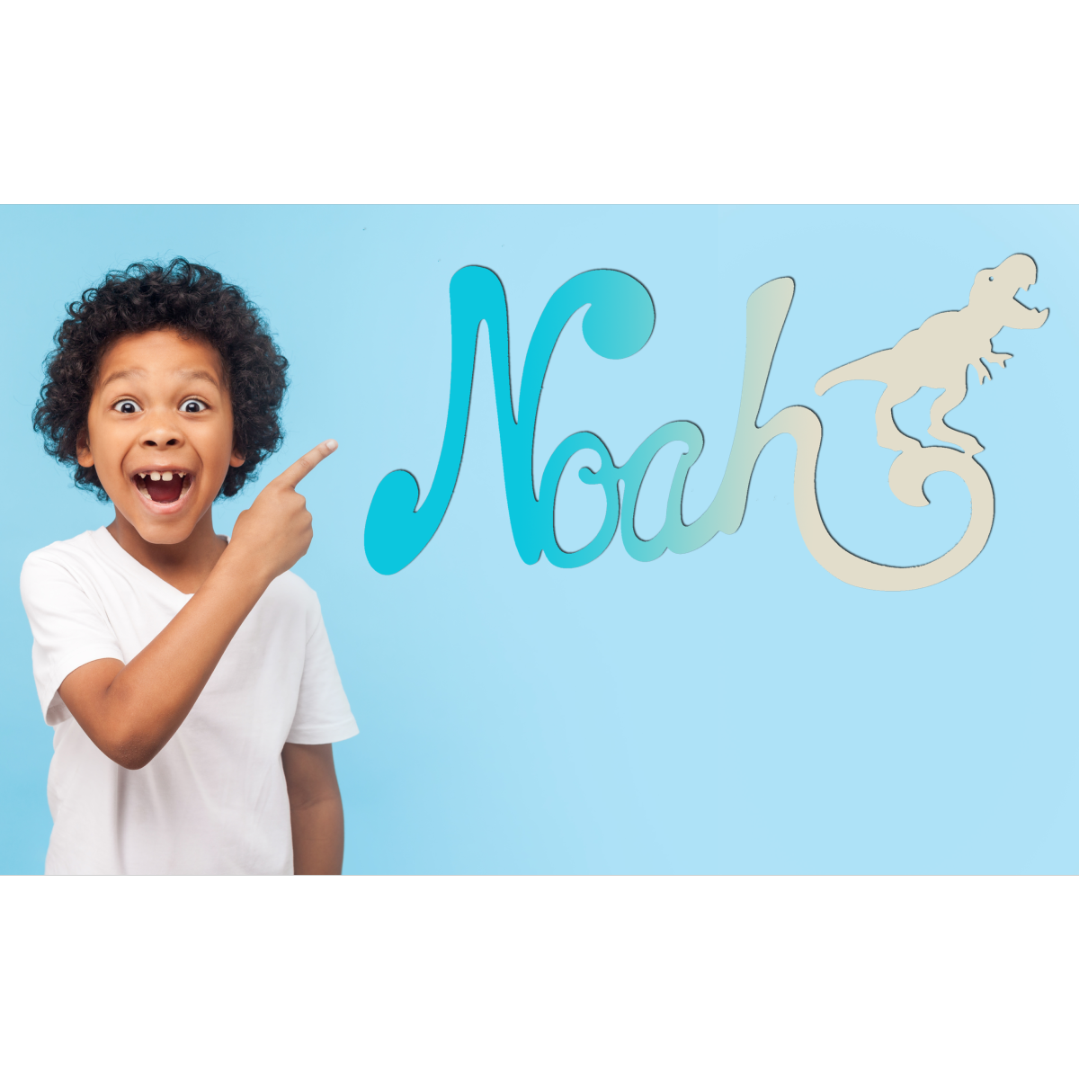 Découvrez cette jolie plaque de porte personnalisée en bois, avec motif Dinosaure en bout de prénom de couleur dégradé Turquoise/Ecru.