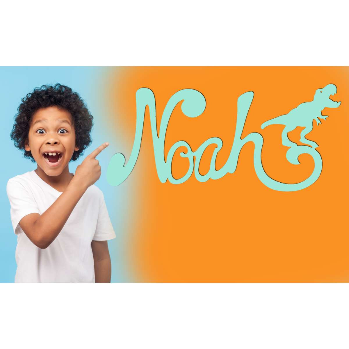 Découvrez cette jolie plaque de porte personnalisée en bois, avec motif Dinosaure en bout de prénom de couleur vert.