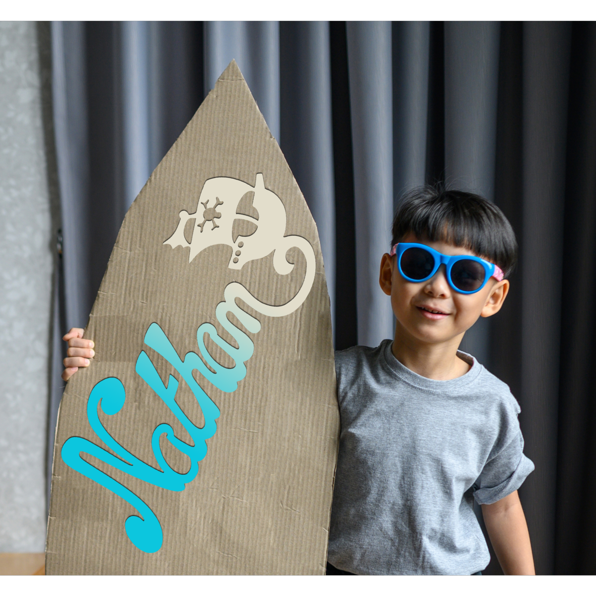 Découvrez cette jolie plaque de porte personnalisée en bois, avec motif Pirate en bout de prénom de couleur dégradé Turquoise/Ecru.