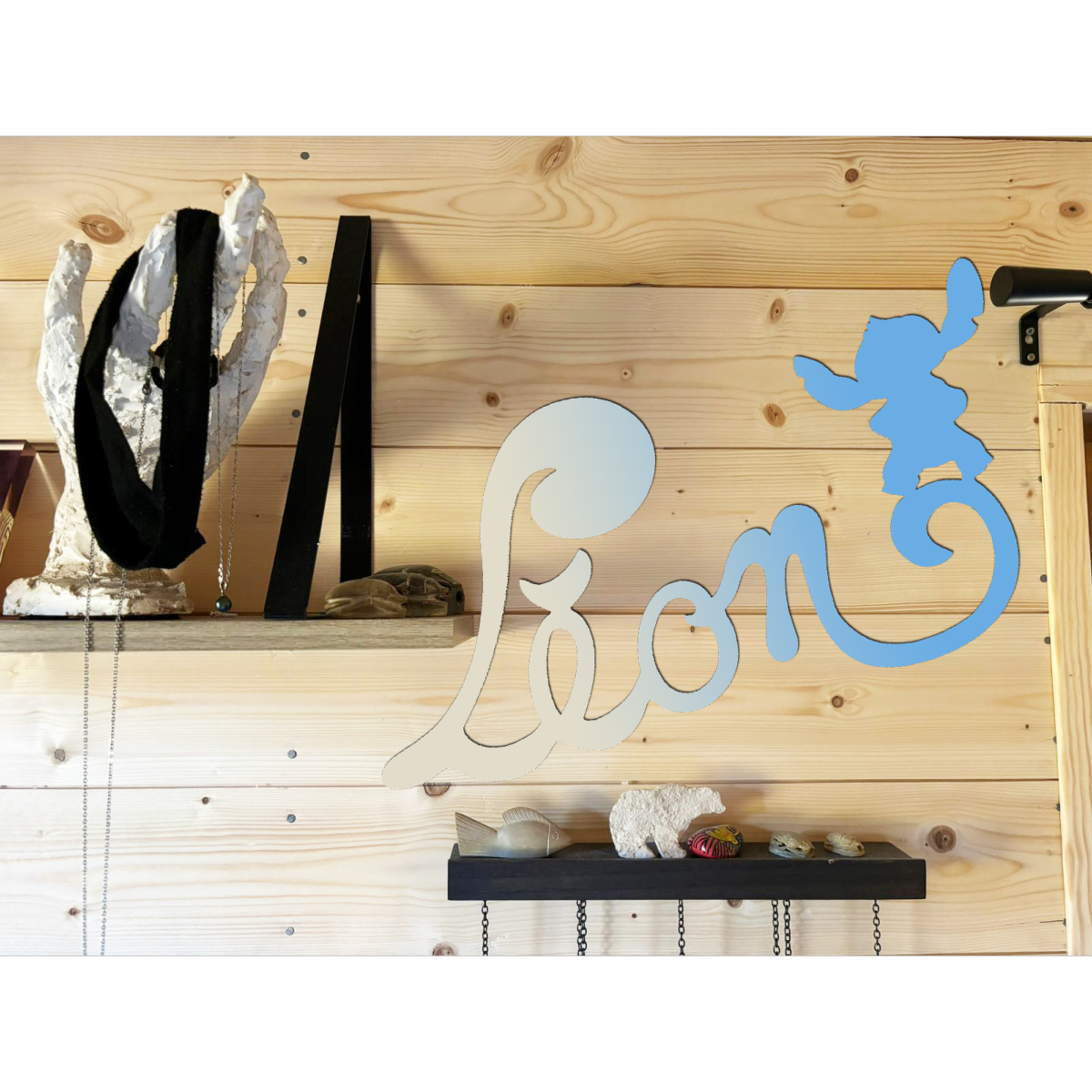 Découvrez cette jolie plaque de porte personnalisée en bois, avec motif Stitch en bout de prénom de couleur dégradé Ecru/Bleu.