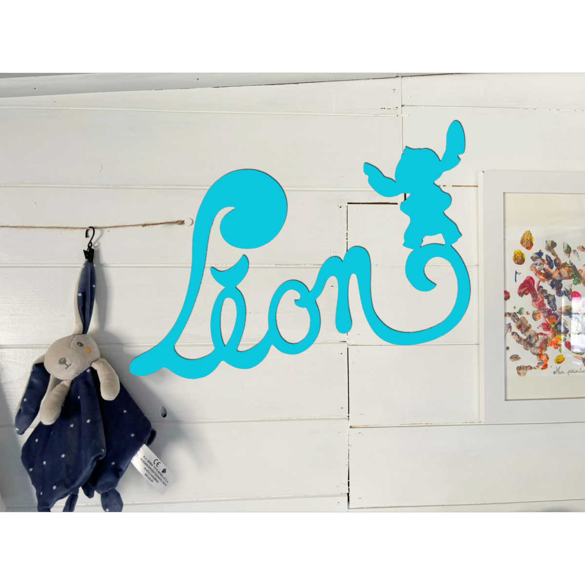 Découvrez cette jolie plaque de porte personnalisée en bois, avec motif Stitch en bout de prénom de couleur Turquoise.