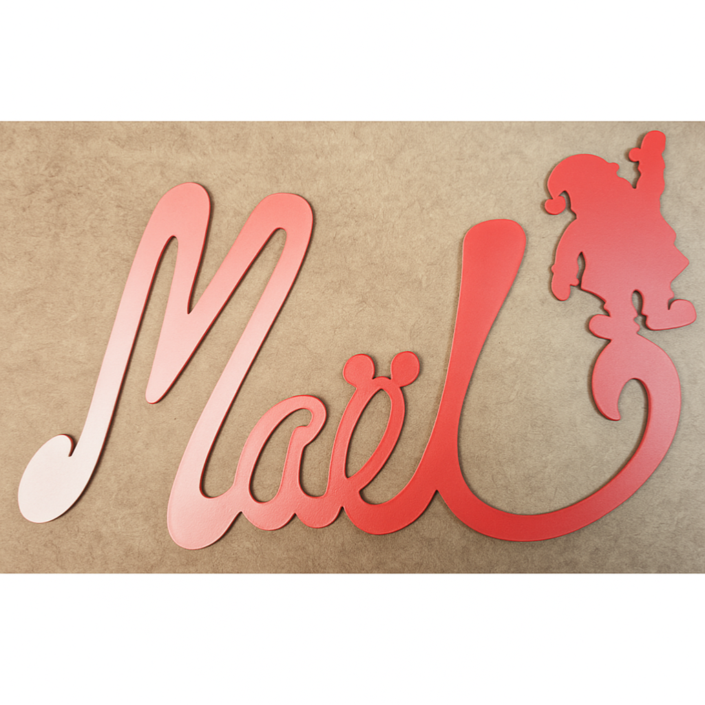 Le prénom de votre enfant est découpé à la main à la scie à chantourner, rendant chaque Plaque de porte Père Noël totalement unique. Une finition au vernis satiné vient sublimer le tout pour un rendu à la fois doux et résistant.