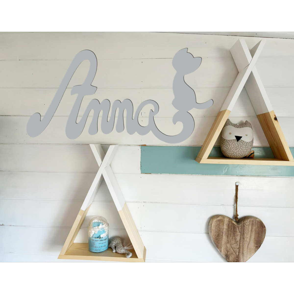 Découvrez cette jolie plaque de porte personnalisée en bois, avec motif Chat en bout de prénom, de couleur Gris.