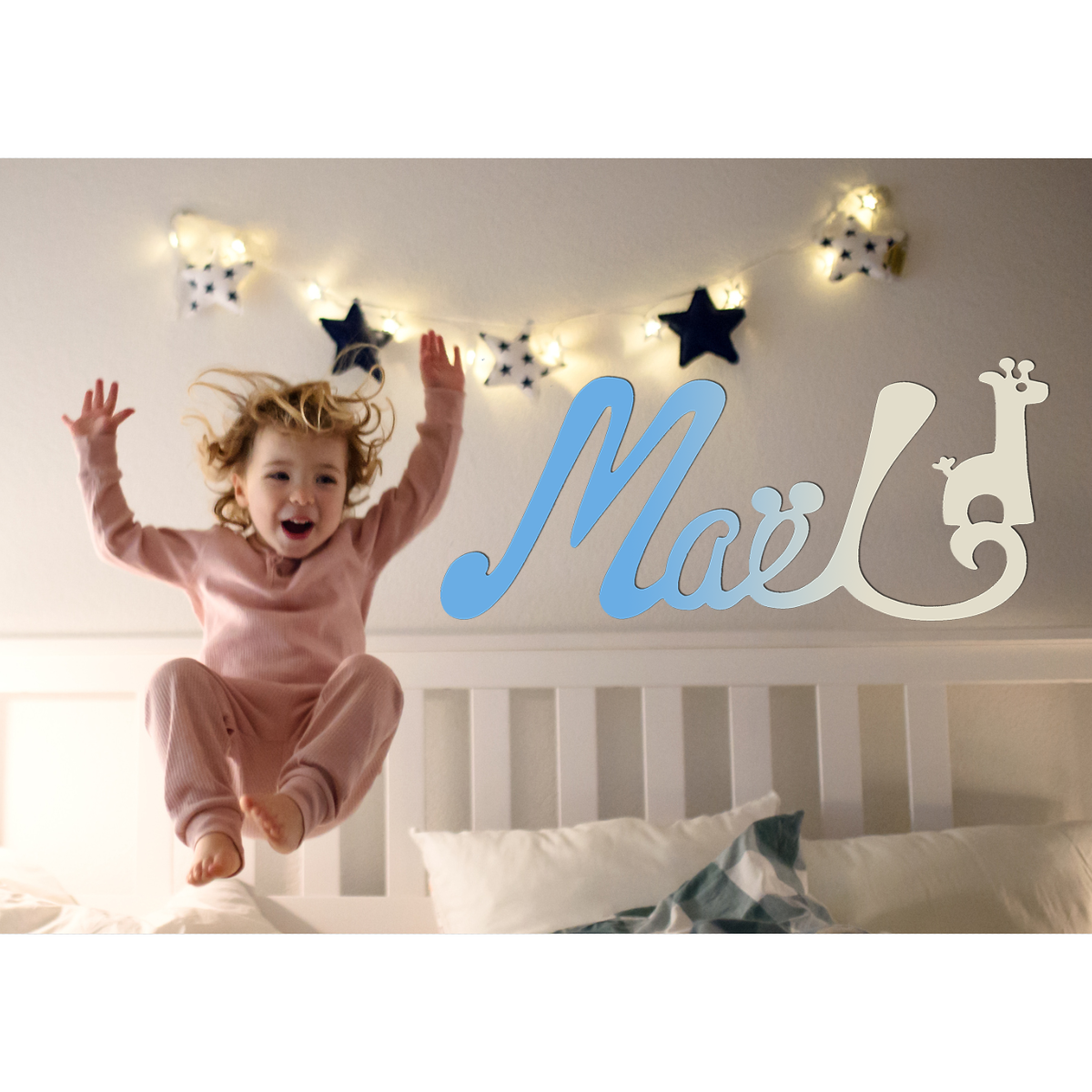 Découvrez cette jolie plaque de porte personnalisée en bois, avec motif Girafe en bout de prénom, de couleur dégradé Bleu/Ecru.