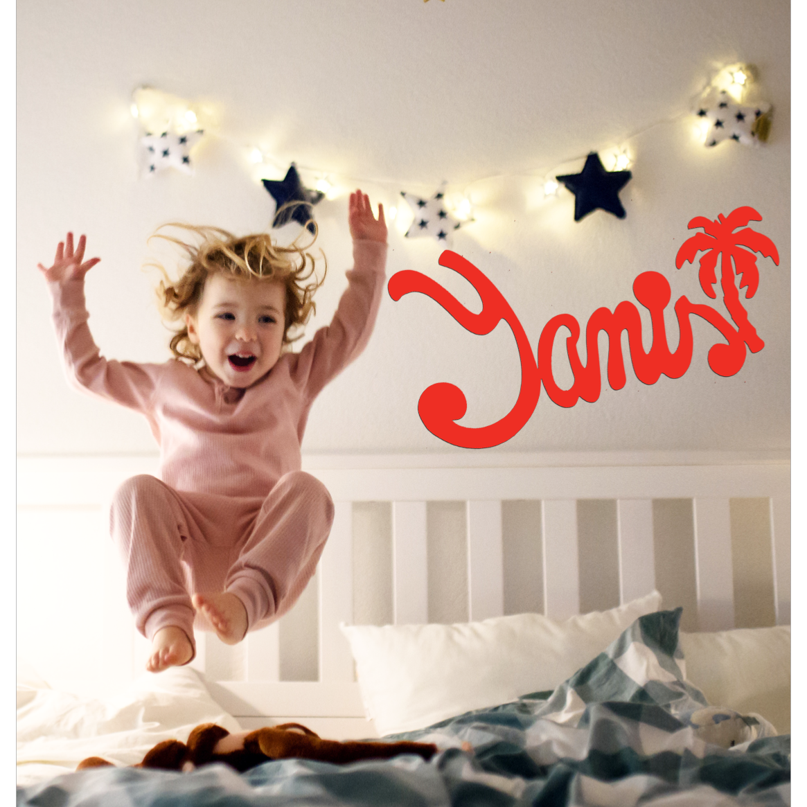 Découvrez cette jolie plaque de porte personnalisée en bois, avec motif Palmier en bout de prénom, de couleur Rouge.
