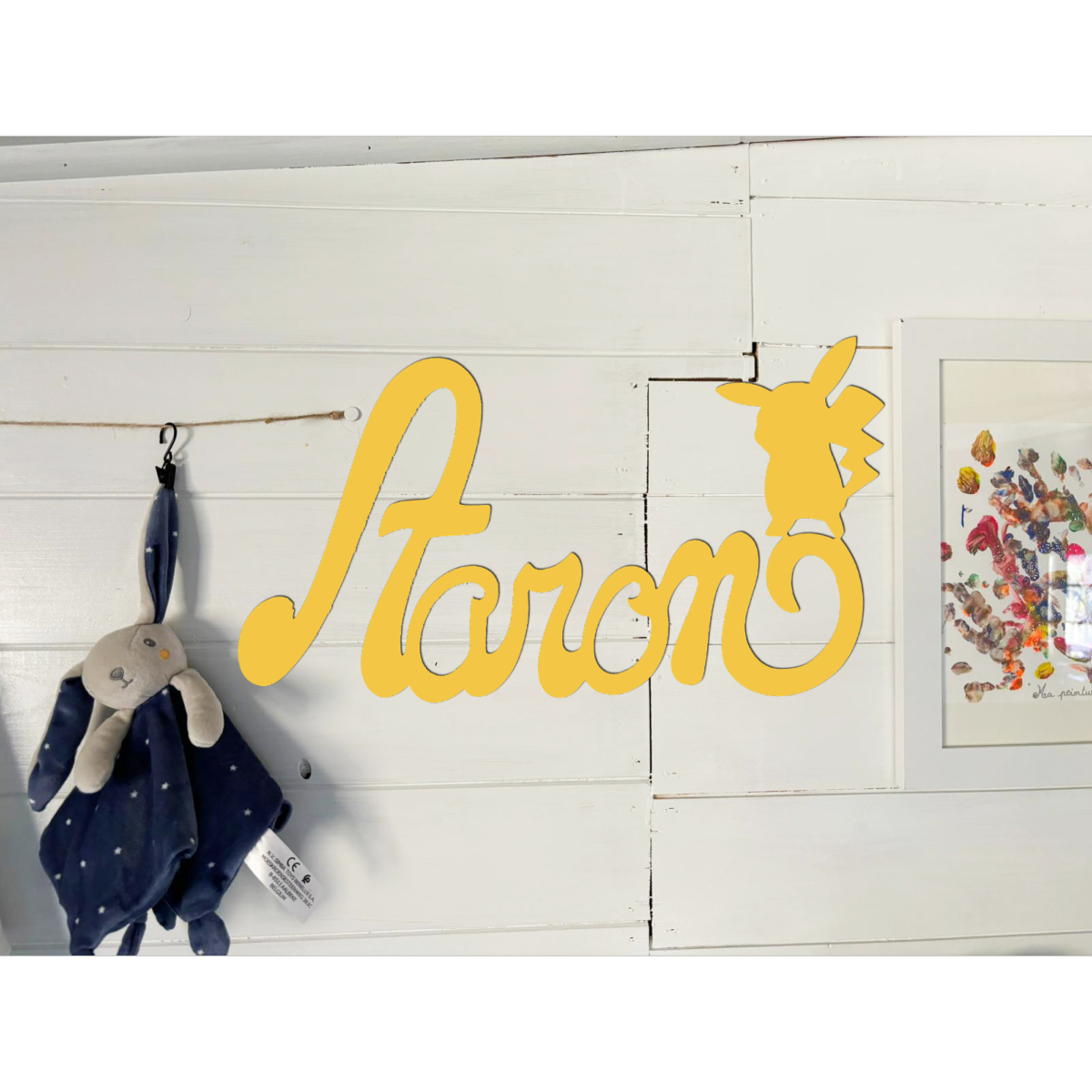 Découvrez cette jolie plaque de porte personnalisée en bois, avec motif Pikachu en bout de prénom, de couleur Jaune.