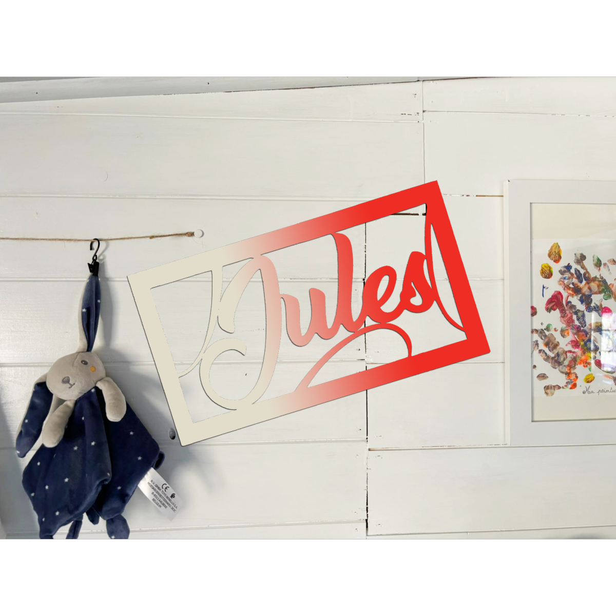 -Le Prénom est réalisé à la main, à la scie à chantourner, puis protégé par un vernis acrylique satin.