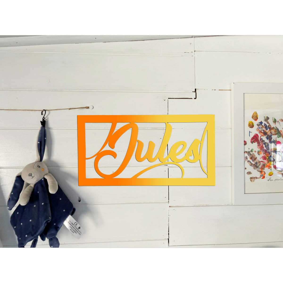 -Le Prénom est réalisé à la main, à la scie à chantourner, puis protégé par un vernis acrylique satin.