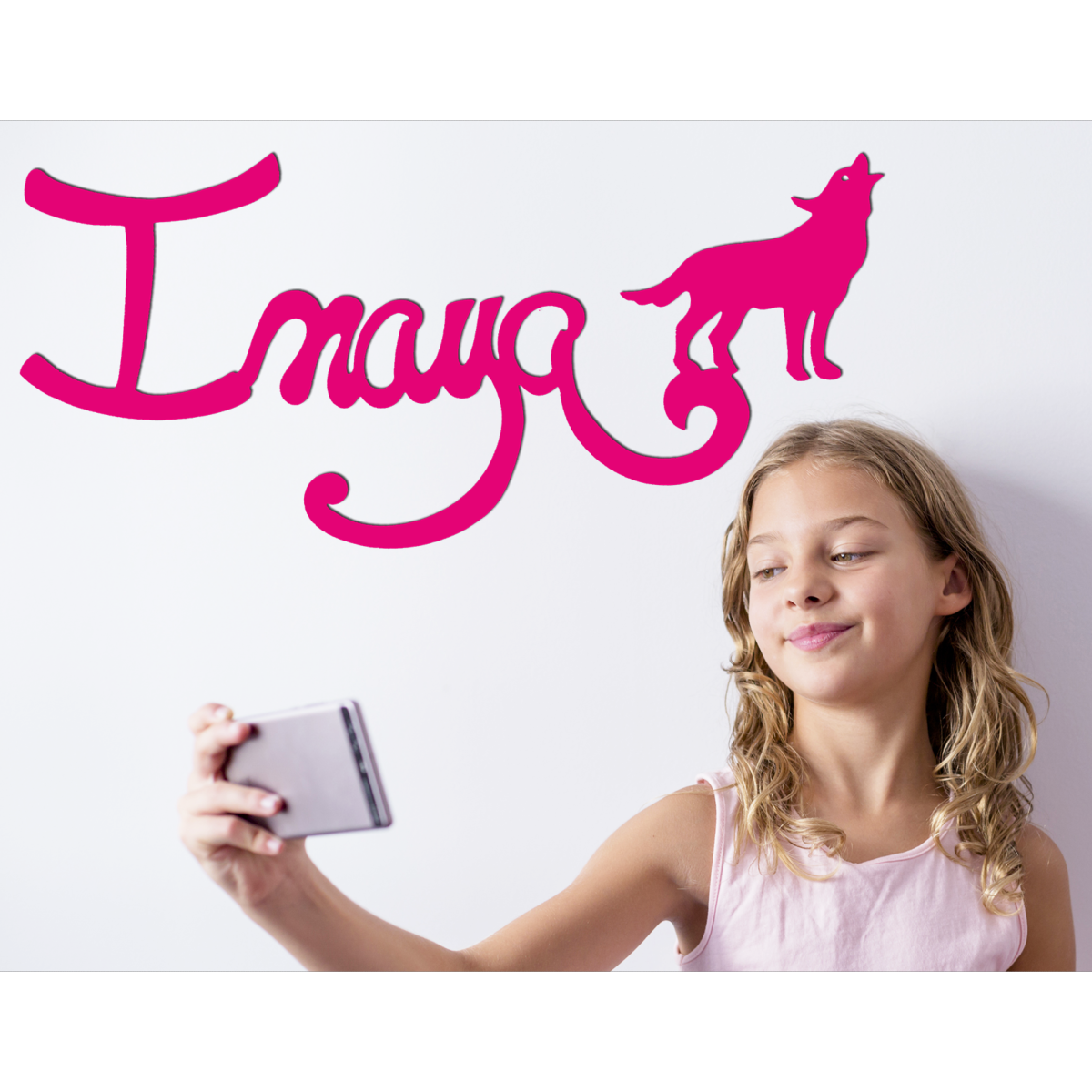 Découvrez cette jolie plaque de porte personnalisée en bois, avec motif Loup en bout de prénom, de couleur Framboise.