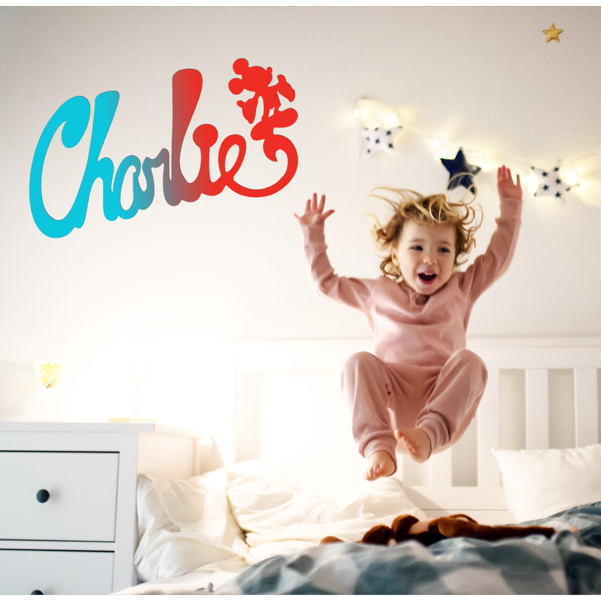 Découvrez cette jolie plaque de porte personnalisée en bois, avec motif Mickey en bout de prénom, de couleur dégradé Turquoise/Rouge.