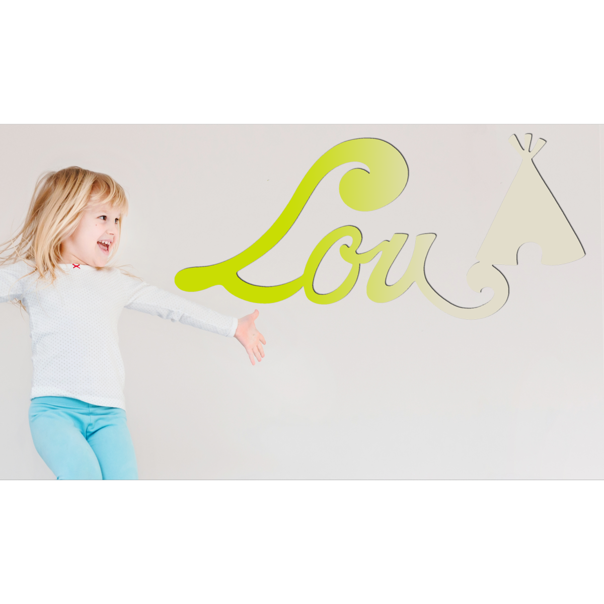 Découvrez cette jolie plaque de porte personnalisée en bois, avec motif Tipi en bout de prénom, de couleur dégradé Pistache/Ecru.