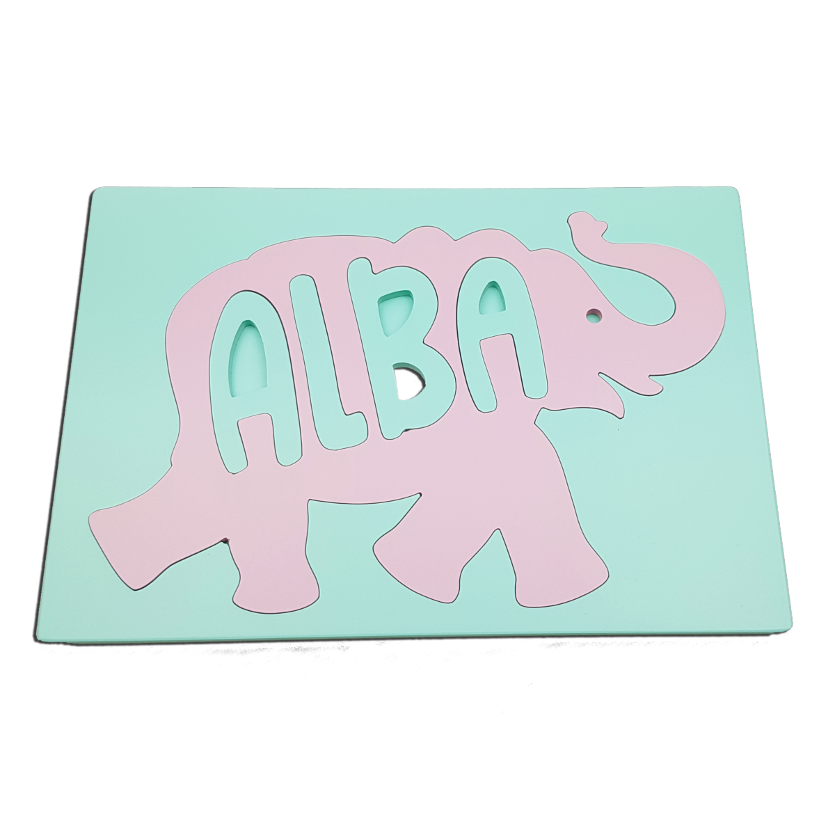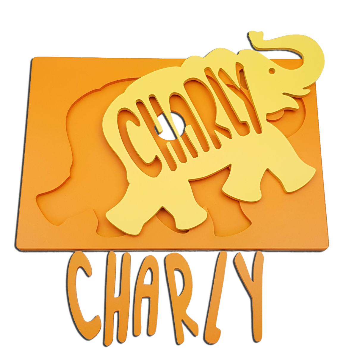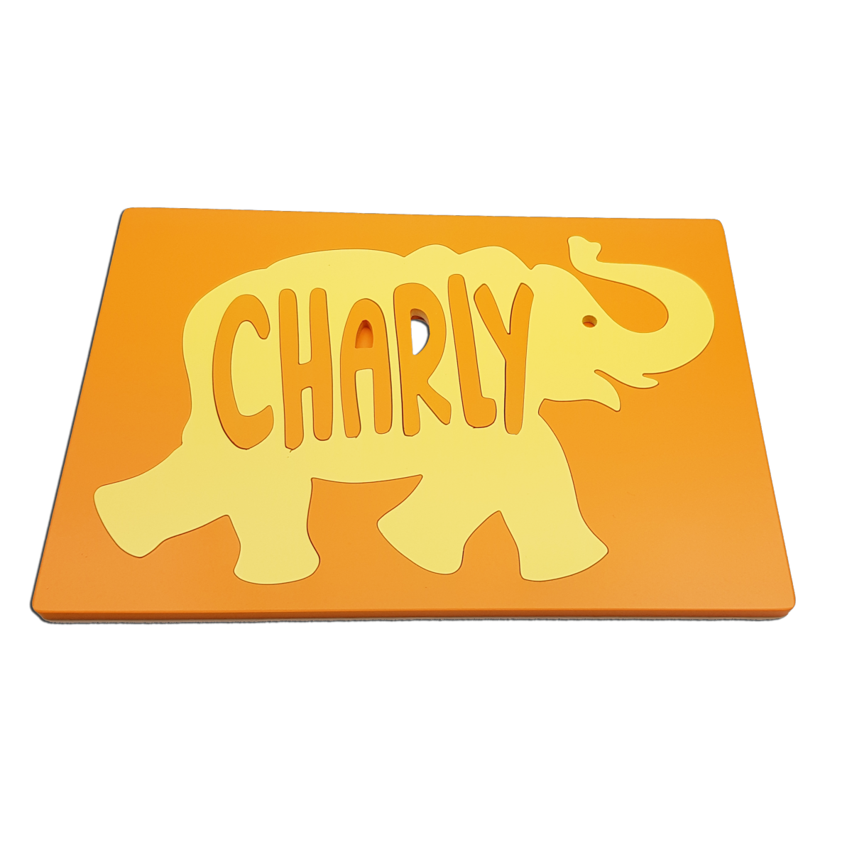 Découvrez ce puzzle éducatif et ludique "Bibou" l'éléphant", personnalisé avec le prénom de votre enfant. 2 couleurs: 1 couleur pour l'éléphant et 1 couleur pour le prénom et le plateau.