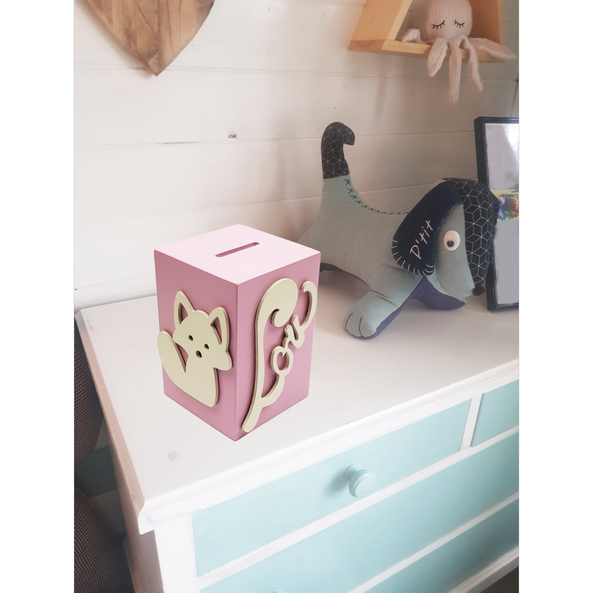 Personnalisation artisanale : Offrez à votre enfant un cadeau unique en gravant son prénom sur la tirelire. Chaque personnalisation est réalisée à la main, avec une grande précision à l'aide d'une scie à chantourner, puis protégée par un vernis acrylique satiné pour garantir une finition soignée et durable.